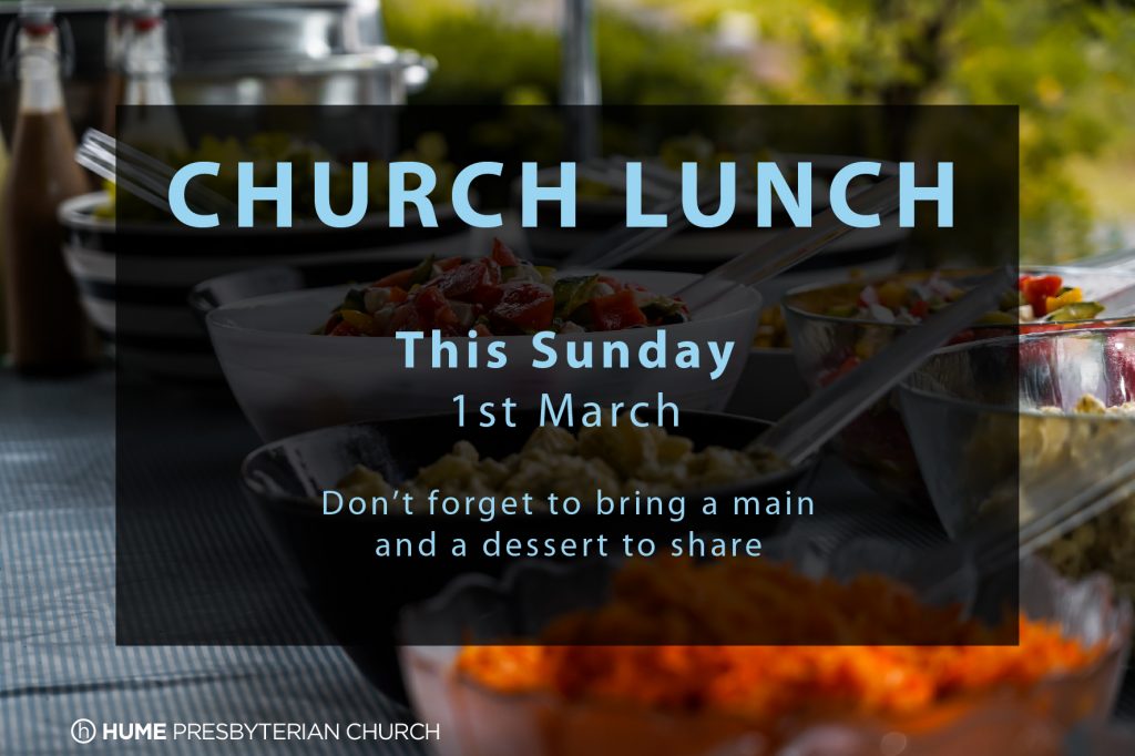Join us for lunch after the service this week. Regulars at Hume, please bring a main and a dessert to share. If you are visiting, you are very … Continue reading Church Lunch