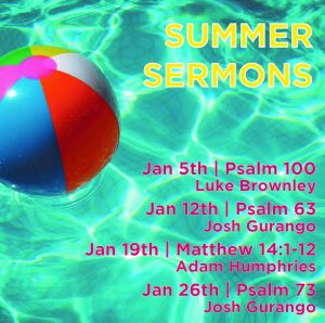 Join us this Summer! Sunday services running all through January | 10am Jan 5th | Psalm 100 Luke BrownleyJan 12th | Psalm 63 Josh GurangoJan 19th | Matthew … Continue reading Summer Sermons
